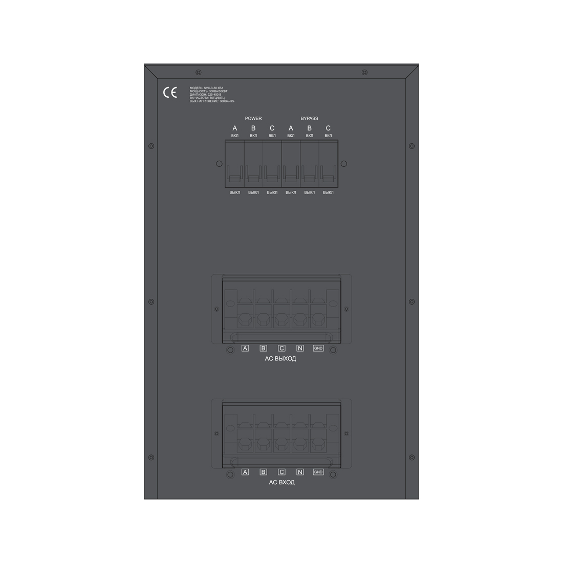 Стабилизатор, SVC, SVC-3-30кВА, Мощность 30кВА/30кВт, Трёхфазный, Индикация режимов работы, Диапазон работы AVR: 225-450В, Вых.напряжение:380В+/-3%, Клеммная колодка, Белый